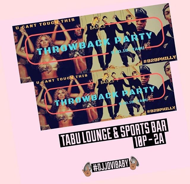 New Event: Back 2 Basics Throwback PartyΒ 09/08/201609/30/2016 / itsjovibaby / Leave a comment – SATURDAY –Β Catch me on the set for the #Back2Basics Throwback party. Playing all that ((Classic)) ish from the 90s & 2000s @ TABU Lounge (200 S. 12th St) #goDJ #DJJOVIBABYπ€π½π